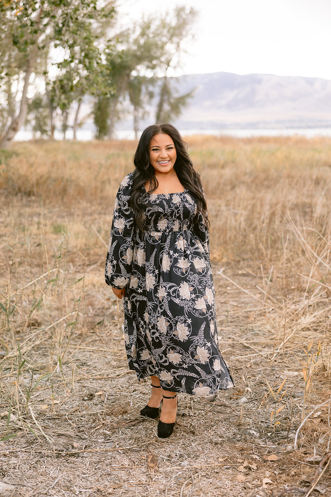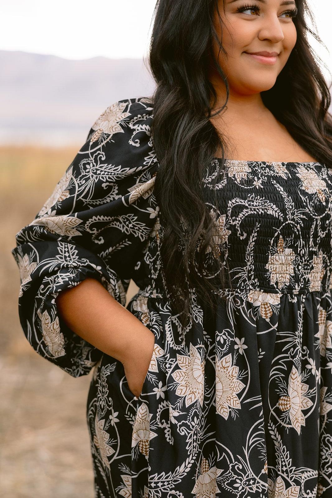 Mid-length dress with square neckline, smocked bodice, and long sleeves. This dress is made to make you feel beautiful! Available in Plus Size.