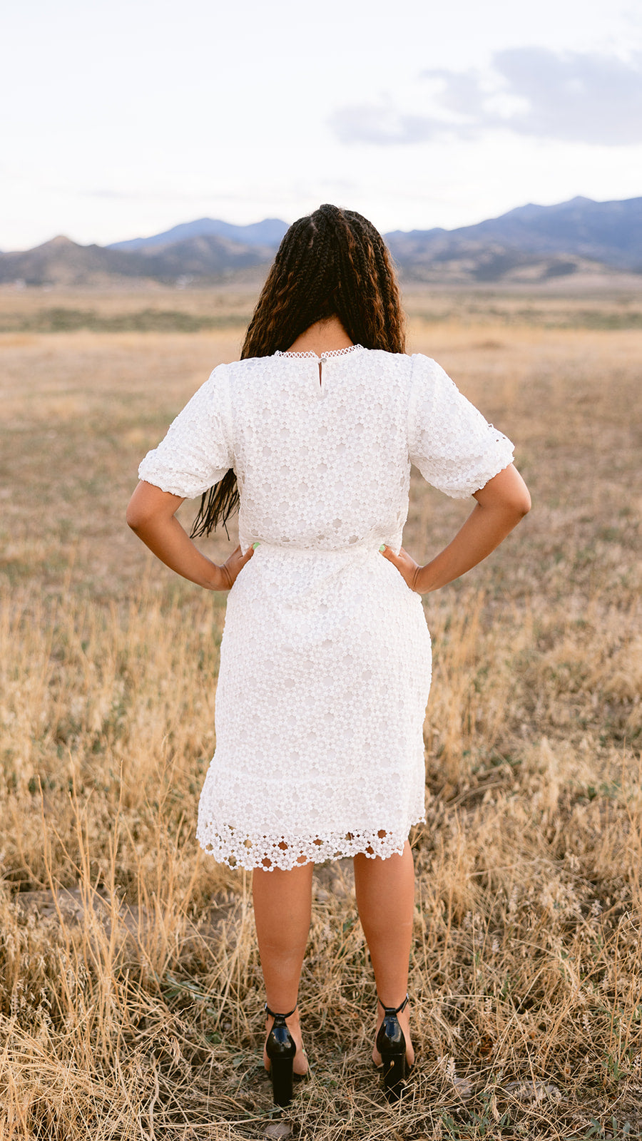 Our Ashen Dress is that perfect white with woven floral detail and the most beautiful loop detail at the neckline. This dress is fully lined, fitted and can be worn throughout the year with any heel to complete the look!