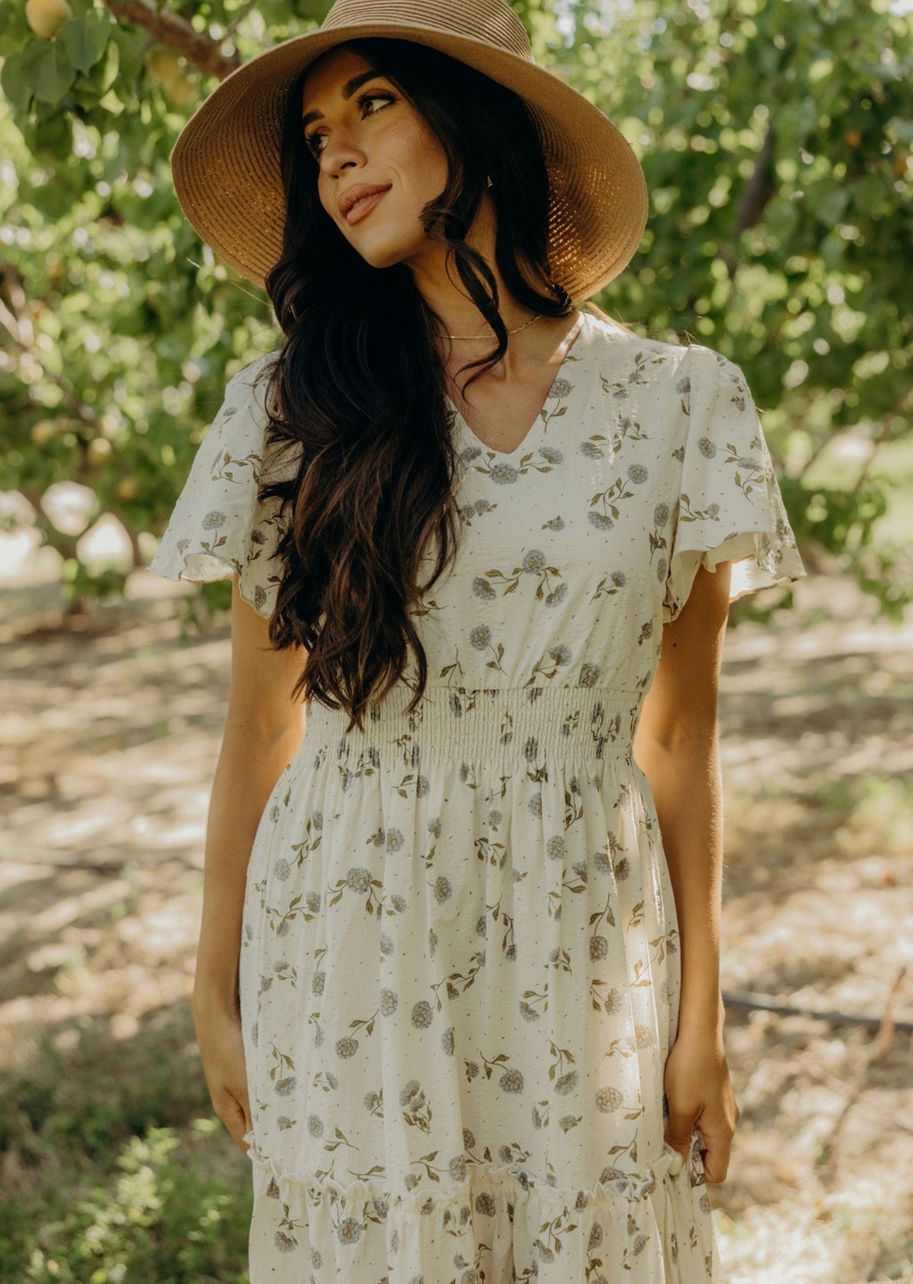 Full-length dress with a tiered skirt, elastic waist, v-neckline and flutter sleeves.