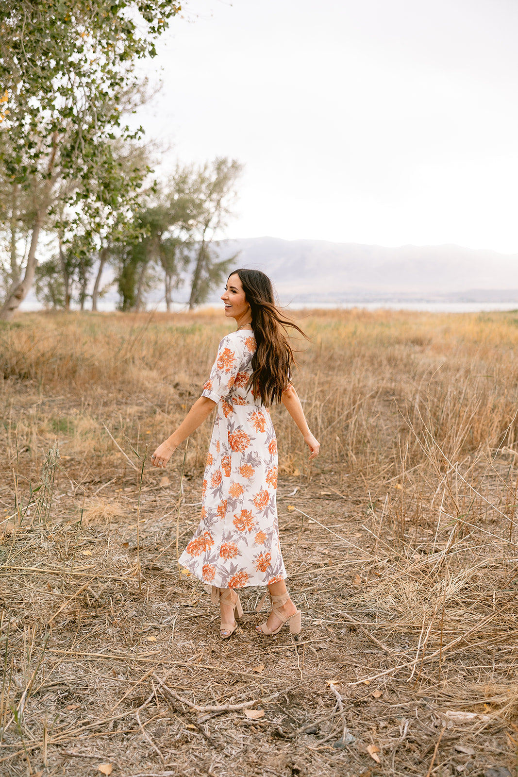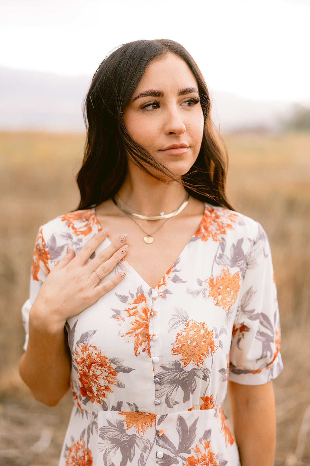 Midi length dress with natural waistline, v neckline, button detail, and mid length sleeve. We love this dress! It has the most feminine look. Get dressed up in some heels for brunch, family photos or a wedding! This dress is available in Plus Size.